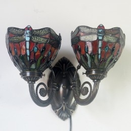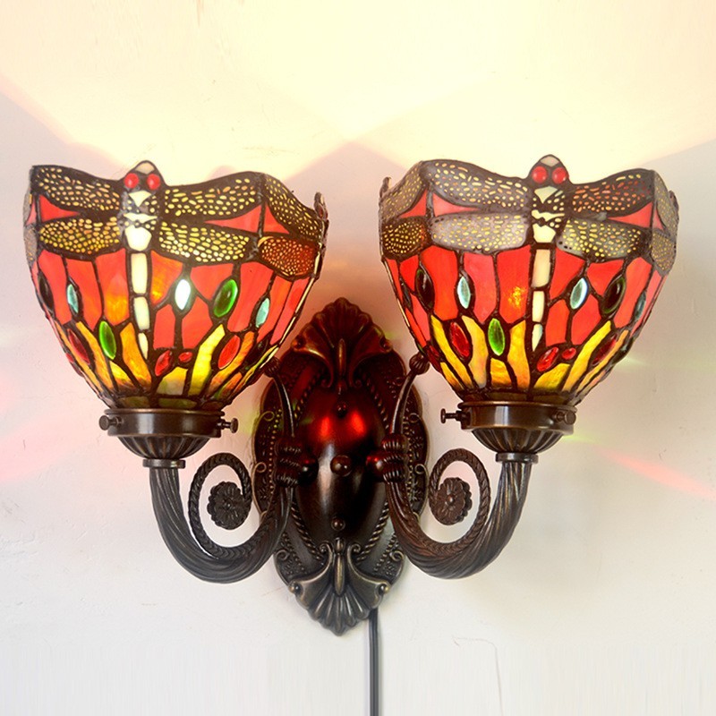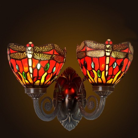 Aplique de parede retrô com 2 luzes vermelhas libélula Tiffany vitral